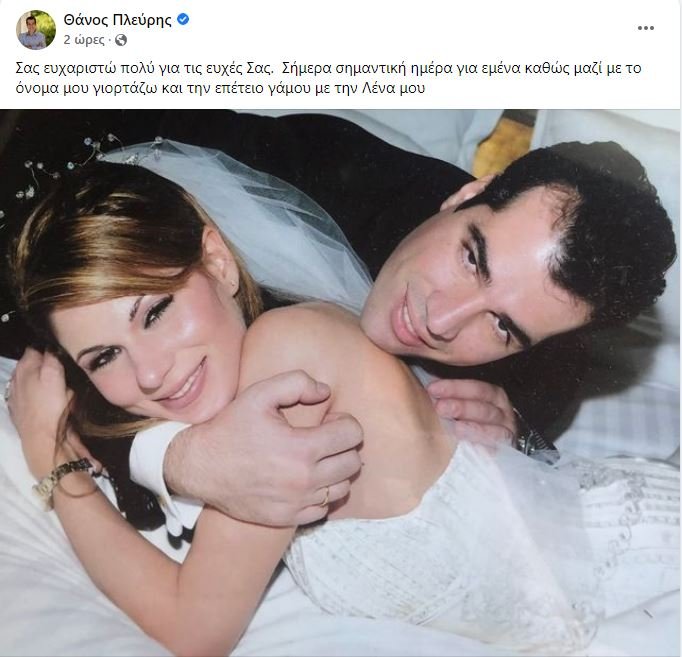 «Σας ευχαριστώ πολύ για τις ευχές Σας. Σήμερα σημαντική ημέρα για εμένα καθώς μαζί με το όνομα μου γιορτάζω και την επέτειο γάμου με την Λένα μου».