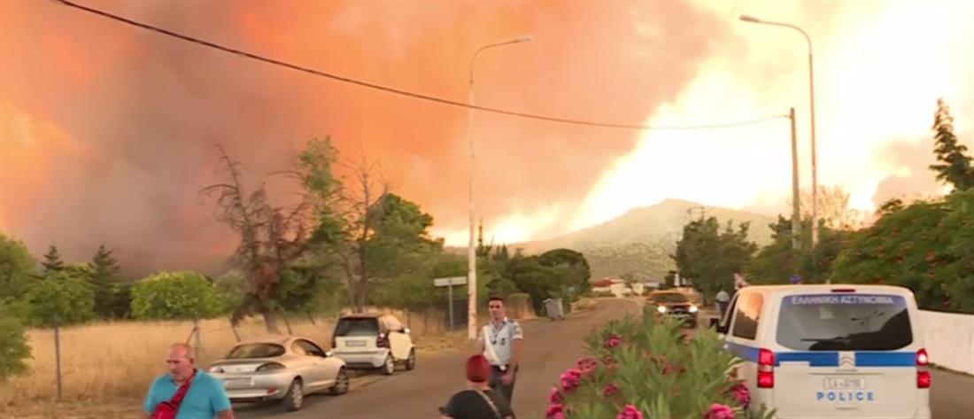 Οι δυνάμεις της Πυροσβεστικής καταβάλλουν αγωνιώδεις προσπάθειες για να αναχαιτίσουν την επέλαση της φωτιάς, που έφθασε σε απόσταση περίπου ενός χιλομέτρου από σπίτια.