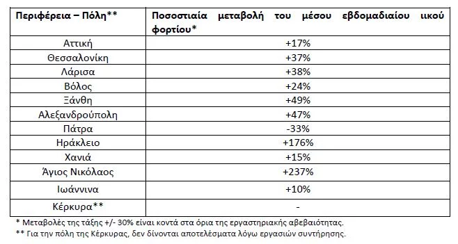 Καθαρά αυξητικές τάσεις ήταν οι τάσεις στο μέσο εβδομαδιαίο ιικό φορτίο των αστικών λυμάτων στον Άγιο Νικόλαο (+237%), στο Ηράκλειο (+176%), στην Ξάνθη (+49%), στην Αλεξανδρούπολη (+47%), στη Λάρισα (+38%) και στη Θεσσαλονίκη (+37%), ενώ οριακή ήταν η αυξητική τάση στο Βόλο (+24%), στην Αττική (+17%) και στα Χανιά (+15%).