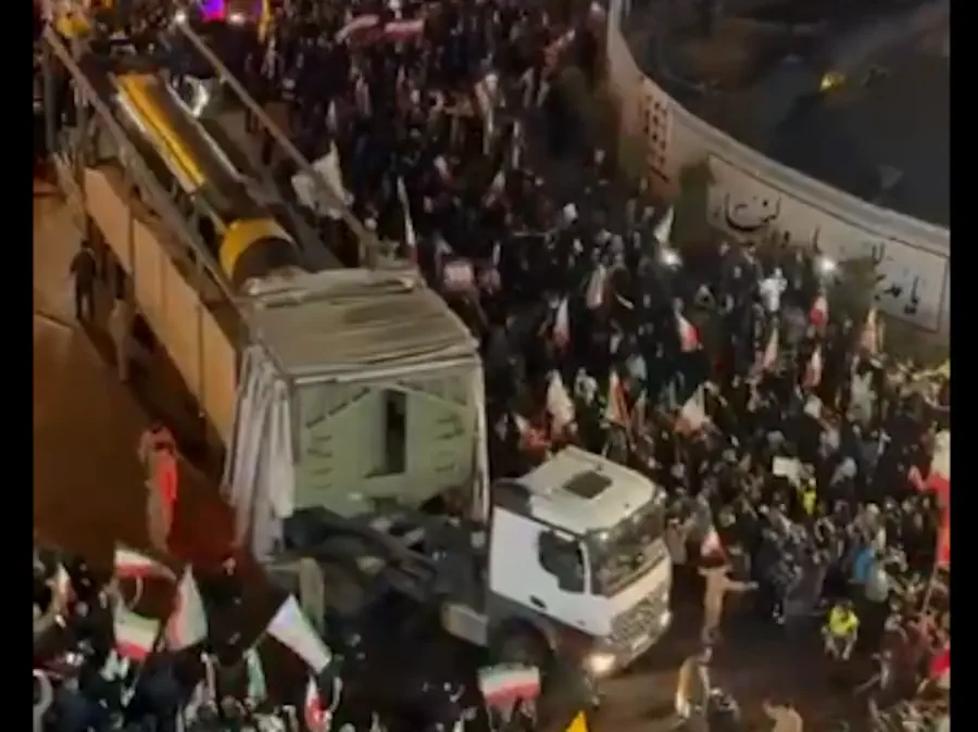 Το πλήθος συγκεντρώθηκε γύρω από ένα πανύψηλο φορτηγό, το οποίο κινούνταν με μικρή ταχύτητα και μετέφερε έναν τεράστιο βαλλιστικό πύραυλο Khorramshahr-4, εμβέλειας 2.000 χιλιομέτρων.