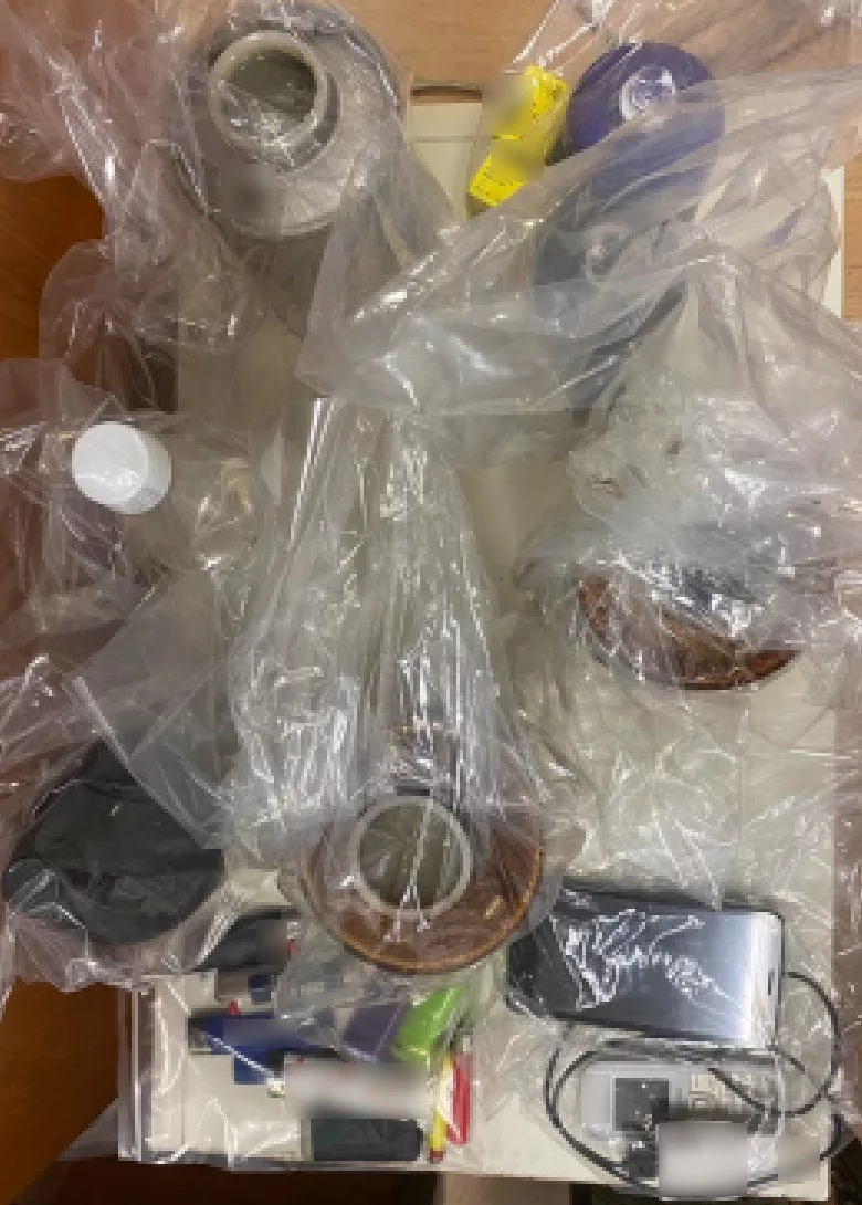Από τις έρευνες που έγιναν τα βρέθηκαν και κατασχέθηκαν: 4 δοχεία με εύφλεκτο υγρό, πλήθος γυάλινων μπουκαλιών, 2 κοντάρια με πυρσούς προσαρτημένους σε αυτά, προσανάμματα φωτιάς και αναπτήρες, αντιασφυξιογόνα μάσκα, μάσκα προσώπου, γάντια και κράνος, μικροποσότητα κάνναβης, 3 κινητά τηλέφωνα και 2 κεντρικές μονάδες ηλεκτρονικού υπολογιστή.
