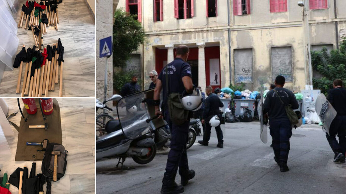 Στο κτήριο που τελούσε υπό κατάληψη βρέθηκαν και κατασχέθηκαν καδρόνια, σφυριά και αντιασφυξιογόνες μάσκες.