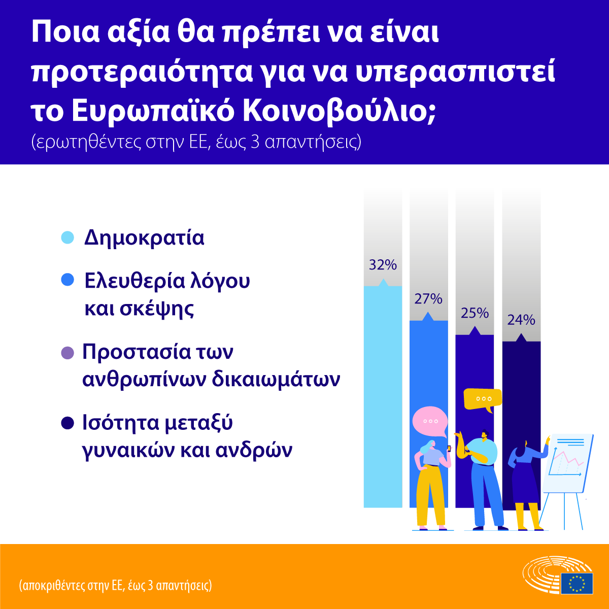 Η υποστήριξη των πολιτών προς την ΕΕ και το ΕΚ ειδικότερα αυξήθηκε σημαντικά κατά τη διάρκεια της πανδημίας. Η πλειοψηφία των πολιτών της ΕΕ (58%) επιθυμεί το Ευρωπαϊκό Κοινοβούλιο να διαδραματίσει σημαντικότερο ρόλο στο μέλλον, ενώ το ποσοστό των πολιτών της ΕΕ που έχουν θετική άποψη για το Ευρωπαϊκό Κοινοβούλιο (36%) αυξήθηκε κατά 12 ποσοστιαίες μονάδες σε σύγκρισή με το 2015, συμπεριλαμβανομένης της αύξησης κατά 3 μονάδες από το 2019. Το 45% των ερωτηθέντων έχει ουδέτερη άποψη για το Ευρωπαϊκό Κοινοβούλιο και μόνο το 17% έχει αρνητική εικόνα. Το 70% των Ελλήνων, ποσοστό σημαντικά μεγαλύτερο ποσοστό από τον ευρωπαϊκό μέσο όρο, ζητά πιο ισχυρό ρόλο για το Ευρωπαϊκό Κοινοβούλιο. Περίπου ένας στους δύο πολίτες στη χώρα μας έχει ουδέτερη εικόνα για το Ευρωπαϊκό Κοινοβούλιο (48%) ενώ οι υπόλοιποι διαμοιράζονται εξίσου μεταξύ της αρνητικής (24%) και της θετικής εικόνας (26%).
