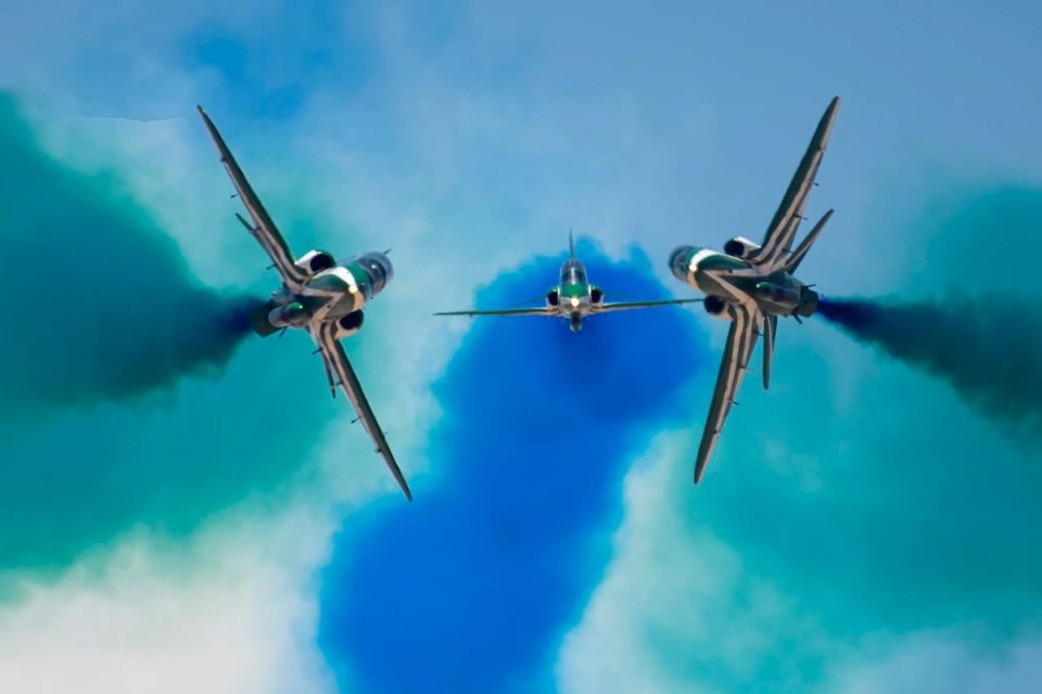 Ακολούθως έλαβε χώρα αεροπορική επίδειξη, κατά την οποία εκτελέστηκαν χαμηλές διελεύσεις μικτού σχηματισμού μαχητικών αεροσκαφών F-16 της Ελληνικής Πολεμικής Αεροπορίας και F-15 της Βασιλικής Αεροπορίας της Σαουδικής Αραβίας, καθώς και Airshow του Ακροβατικού Σμήνους των «Saudi Falcons», κατά το οποίο απεδόθησαν ιδιαίτερες τιμές στη Γαλανόλευκη.