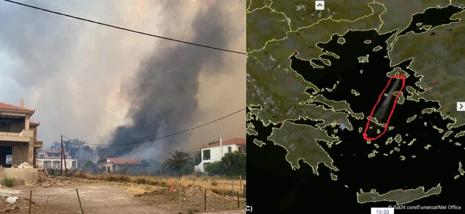 Εικόνες που καταγράφηκαν από τους δορυφόρους δείχνουν τους καπνούς, από τη φωτιά που ξέσπασε μόλις σήμερα το πρωί, να έχουν φτάσει έως και τις Κυκλάδες, όπως επισημαίνει ο μετεωρολόγος κ. Γιάννης Καλλιάνος.