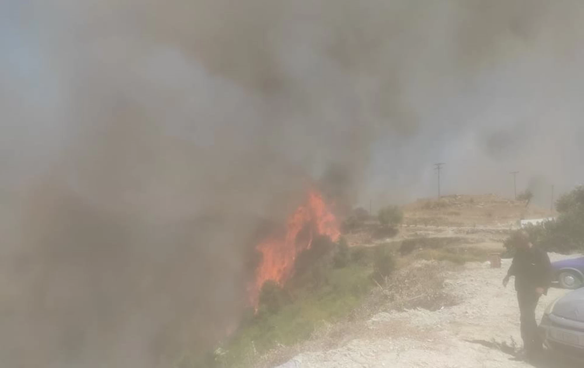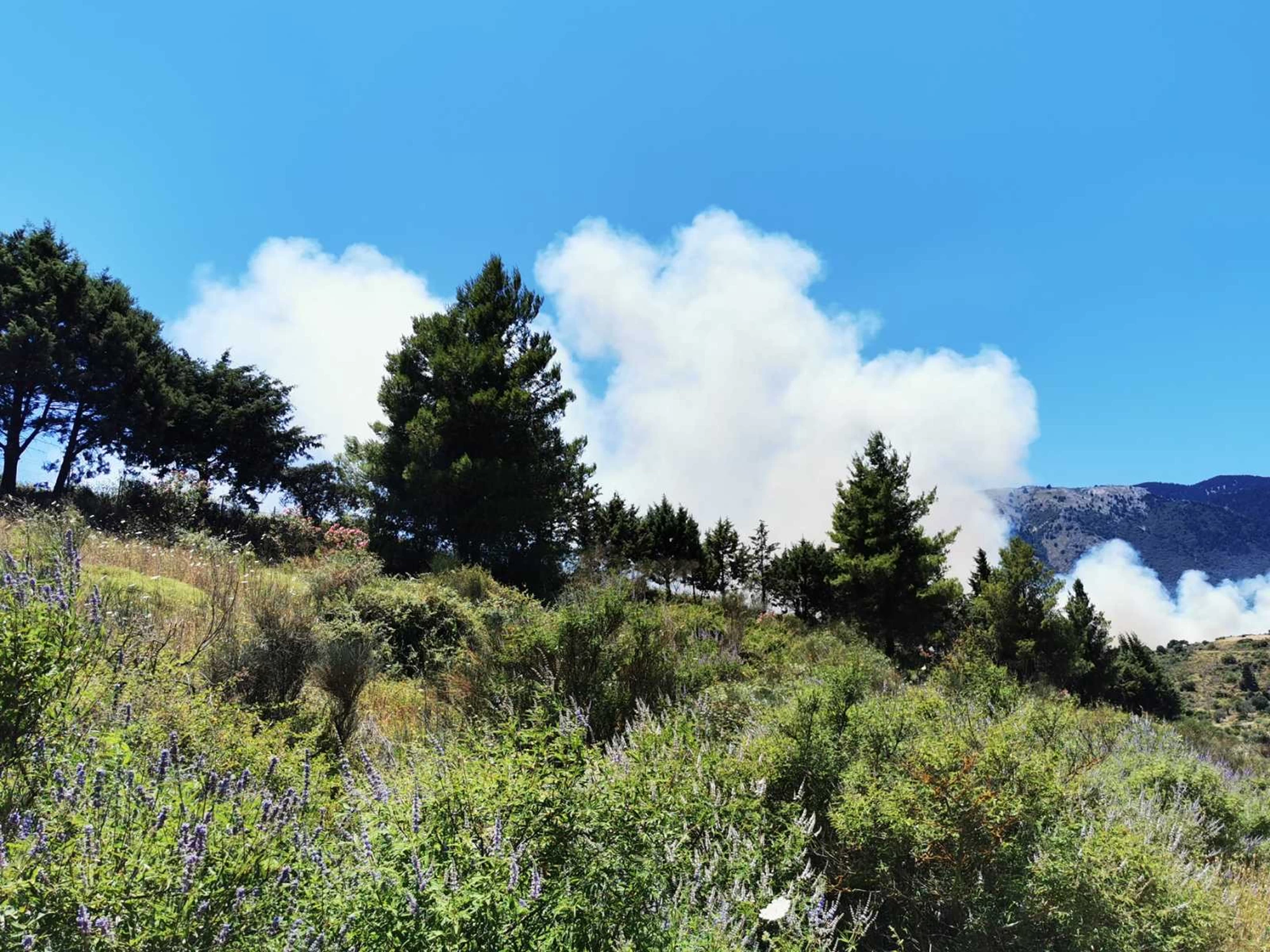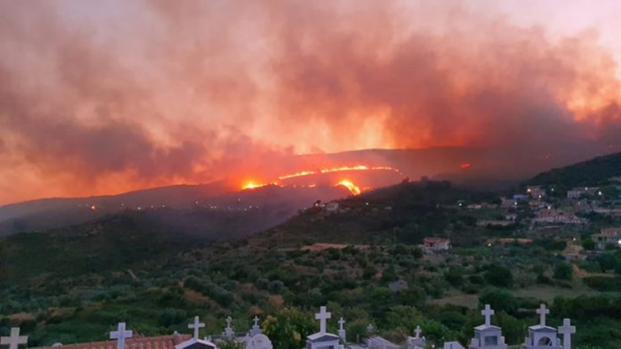 Σύμφωνα με πληροφορίες υπάρχουν πέντε ενεργά μέτωπα, γύρω από τα χωριά Αγία Ειρήνη, Καπανδρίτι, Καμπιτσάτα και η κατεύθυνση του ανέμου οδηγεί την πυρκαγιά, νότια προς το χωριό της Σκάλας, ενώ όλες οι δυνάμεις της Πυροσβεστικής καταβάλουν μεγάλη προσπάθεια για να περιορίσουν τα μέτωπα.