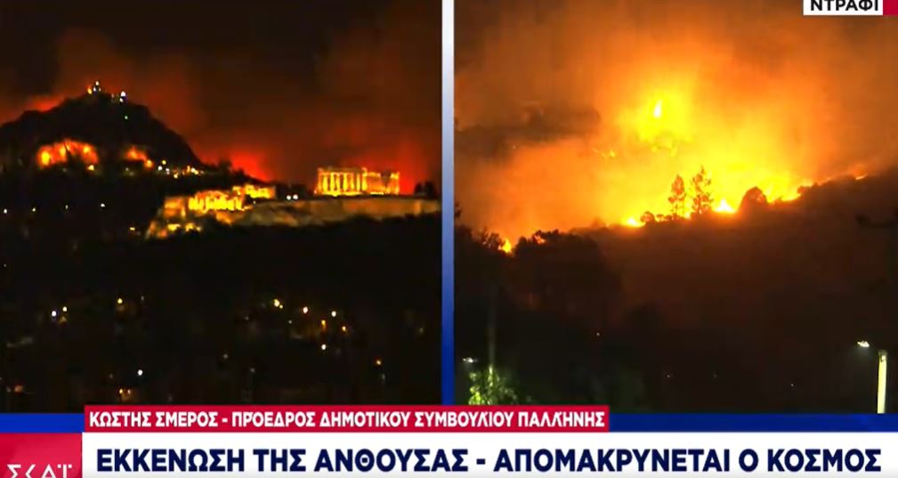 Αυτή τη στιγμή οι δυνάμεις της πυροσβεστικής έχουν να αντιμετωπίσουν δύο μέτωπα: ένα μέτωπο που κινείται αργά προς το βουνό και ένα δεύτερο (το δύσκολο μέτωπο) που κινείται νότια προς Ντράφι – Νέα Πεντέλη.