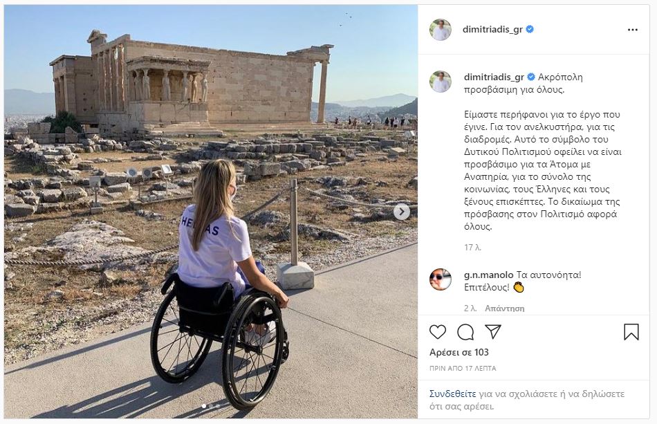 Ακρόπολη προσβάσιμη σε όλους γράφει στο instagram ο διευθυντής του πρωθυπουργικού γραφείου Γρηγόρης Δημητριάδης αναφερόμενος στα έργα που έγιναν από το υπουργείο Πολιτισμού.