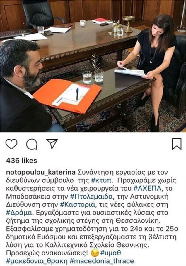 Η κυρία Νοτοπούλου έγραψε χαρακτηριστικά: «Συνάντηση εργασίας με τον διευθύνων (σ.σ: αντί διευθύνοντα) σύμβουλο της #κτυπ. Προχωράμε χωρίς καθυστερήσεις».