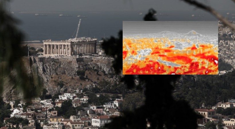 Στο βίντεο που δημοσίευσε το Up Stories, καταγράφονται μερικά στιγμιότυπα από τον Ιερό Βράχο της Ακρόπολης όπου η θερμοκρασία εδάφους ξεπερνούσε τοπικά τους 55°C (βαθύ κόκκινο χρώμα και λευκό), όπως και στο ιστορικό κέντρο της Αθήνας, στην Πλατεία Ομονοίας.