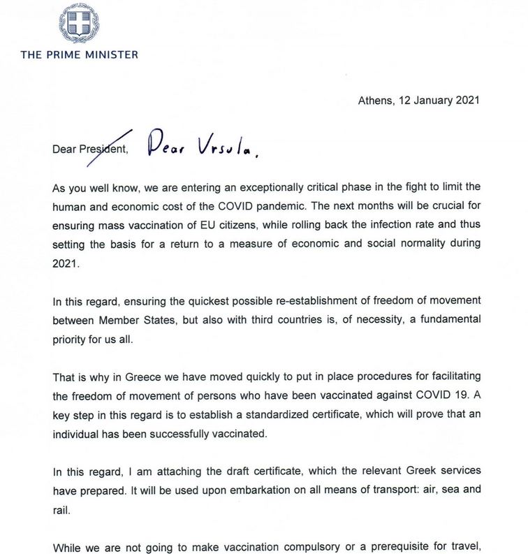 Την εισαγωγή ενός πιστοποιητικού εμβολιασμού για τη «διευκόλυνση της ελεύθερης κυκλοφορίας των ατόμων που έχουν εμβολιαστεί κατά της Covid-19», πρότεινε η ελληνική κυβέρνηση στην Ε.Ε. με επιστολή του πρωθυπουργού Κυριάκου Μητσοτάκη προς την πρόεδρο της Ευρωπαϊκής Επιτροπής Ούρσουλα φον ντερ Λάιεν και τους αρχηγούς τον κρατών-μελών.