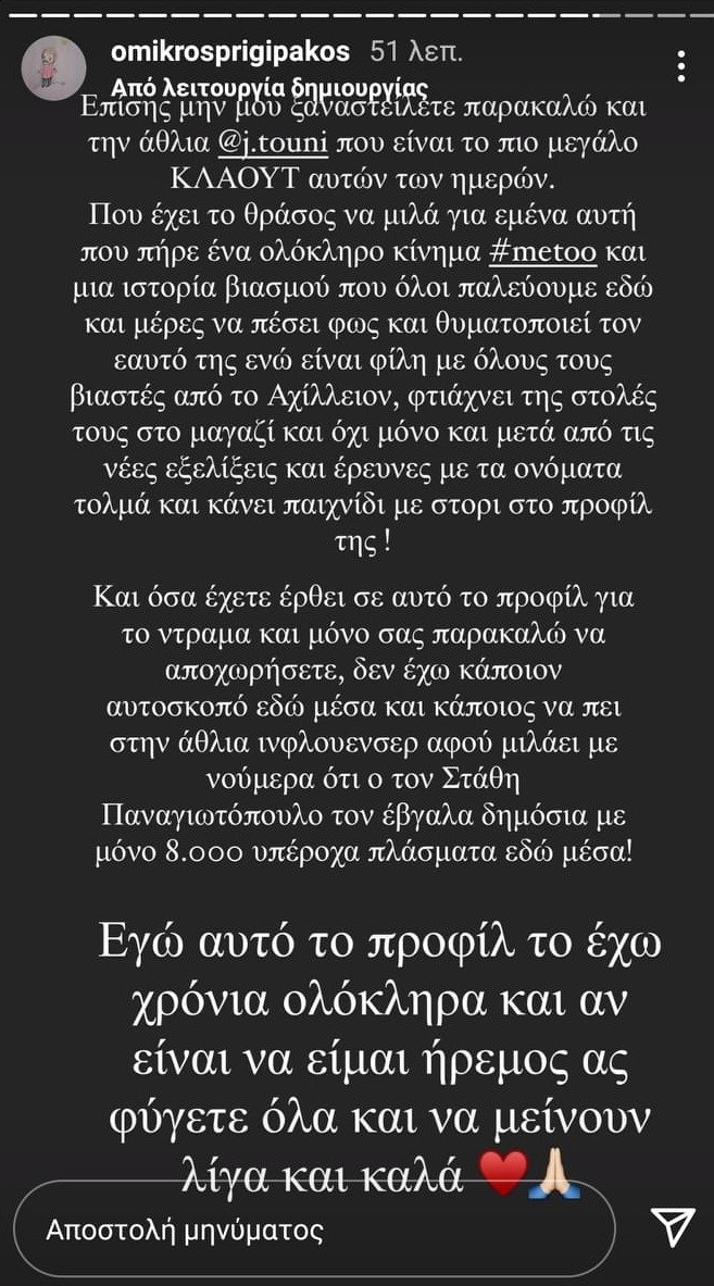 Και μετά από τις νέες εξελίξεις και έρευνες με τα ονόματα, τολμά και κάνει παιχνίδι με στόρις στο προφίλ της. Και όσα έχετε έρθει σε αυτό το προφίλ για το ντράμα και μόνο σας παρακαλώ να αποχωρήσετε. Δεν έχω κάποιον αυτοσκοπό εδώ μέσα και κάποιος να πει στην άθλια ινφλουένσερ αφού μιλάει με νούμερα, ότι τον Στάθη Παναγιωτόπουλο τον έβγαλα μόνο με 8.000 υπέροχα πλάσματα εδώ μέσα.