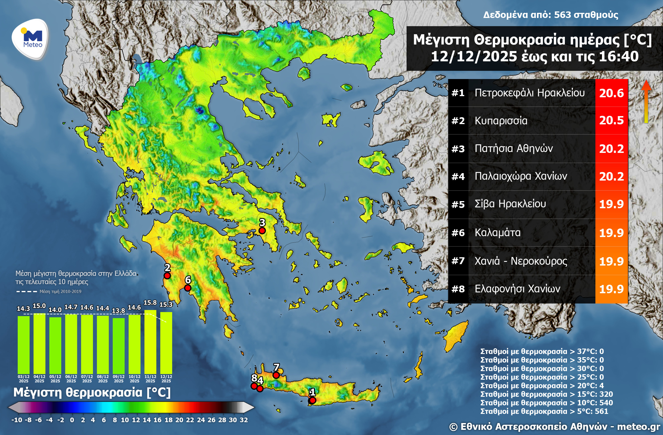 Ξεπέρασε τους 20 °C η μέγιστη θερμοκρασία στη χώρα το μεσημέρι της Παρασκευής 12/12. Οι υψηλότερες θερμοκρασίες σημειώθηκαν στην Κρήτη (Πετροκεφάλι Ηρακλείου – 20.6 °C, Παλαιόχωρα Χανίων – 20.2°C), στην Πελοπόννησο (Κυπαρισσία – 20.5 °C) και στην Στερεά Ελλάδα (Πατήσια Αθηνών – 20.2°C). Στον χάρτη της εικόνα που ακολουθεί παρουσιάζεται η κατανομή της μέγιστης θερμοκρασίας την Παρασκευής 12/12 σύμφωνα με τις καταγραφές του δικτύου αυτόματων μετεωρολογικών σταθμών του meteo.gr / Εθνικού Αστεροσκοπείου Αθηνών.