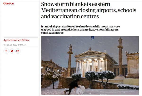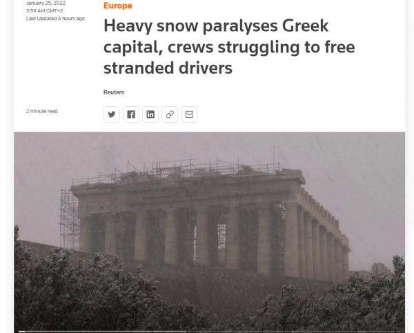 «Οι σφοδρές χιονοπτώσεις είναι σπάνιες στην Αθήνα, όμως η πόλη επλήγη από χιονοκαταιγίδα για δεύτερο συνεχόμενο έτος», σημειώνει επίσης το διεθνές ειδησεογραφικό πρακτορείο.
