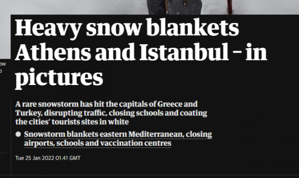 Από την πλευρά του, ο βρετανικός The Guardian μεταφέρει με εικόνες την κατάσταση που επικρατεί τόσο στην Αθήνα όσο και στην Κωνσταντινούπολη. Σημειώνεται, άλλωστε, πως στην τουρκική μεγαλούπολη τα προβλήματα ήταν ακόμη μεγαλύτερα, με αποτέλεσμα να διακοπεί και η λειτουργία του διεθνούς αεροδρομίου.