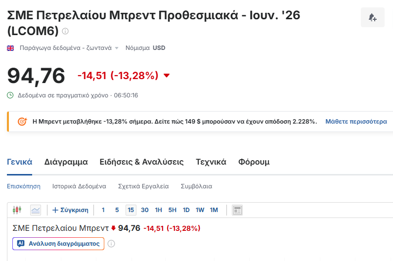 Το Brent κατέγραψε πτώση έως και 16% πριν σταθεροποιηθεί κοντά στα 95 δολάρια το βαρέλι, ενώ το αμερικανικό West Texas Intermediate σημείωσε τη μεγαλύτερη πτώση των τελευταίων σχεδόν έξι ετών, υποχωρώντας περίπου στα 96 δολάρια.