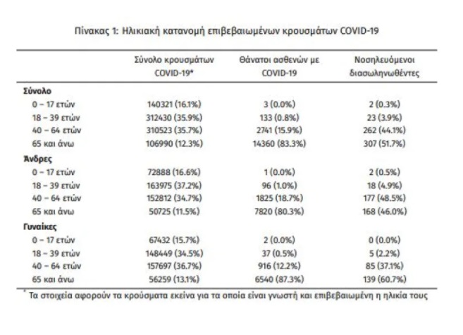 Τα νέα εργαστηριακά επιβεβαιωμένα κρούσματα της νόσου που καταγράφηκαν τις τελευταίες 24 ώρες είναι 5.991 , εκ των οποίων 4 εντοπίστηκαν κατόπιν ελέγχων στις πύλες εισόδου της χώρας. Ο συνολικός αριθμός των κρουσμάτων ανέρχεται σε 874.812 (ημερήσια μεταβολή +0.7%), εκ των οποίων 50.6% άνδρες. Με βάση τα επιβεβαιωμένα κρούσματα των τελευταίων 7 ημερών, 108