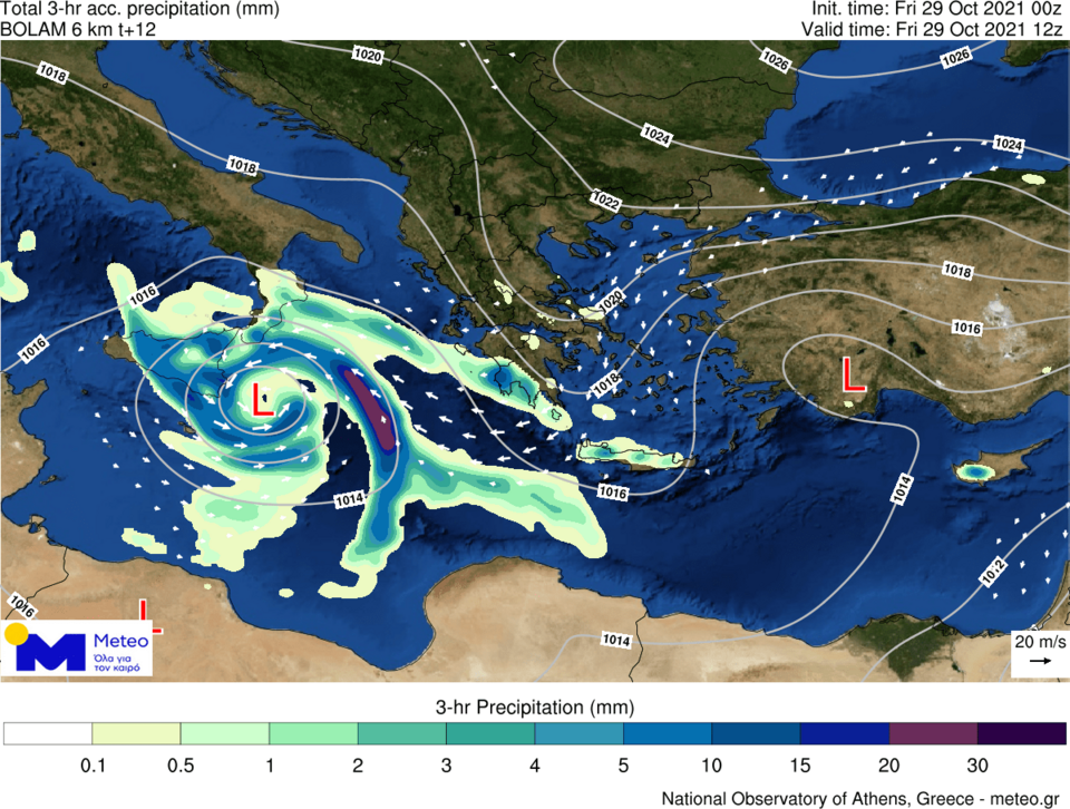 Ενενήντα χιλιόμετρα νοτιοανατολικά της Σικελίας βρίσκεται ο μεσογειακός κυκλώνας Νέαρχος, που σχηματίστηκε στις 28 Οκτωβρίου στην Κεντρική Μεσόγειο, όπως δείχνει δορυφορική εικόνα του ευρωπαϊκού μετεωρολογικού δορυφόρου Meteosat-11, που έλαβε και επεξεργάστηκε το Εθνικό Αστεροσκοπείο Αθηνών/meteo.gr.