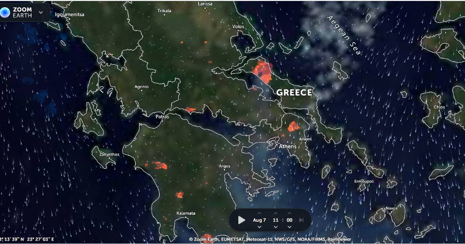 Την εξέλιξη των μεγάλων πυρκαγιών που καίνε σε διάφορες περιοχές της Ελλάδας καταγράφει σε ζωντανή σύνδεση μέσω δορυφόρου η εφαρμογή Zoom Earth.