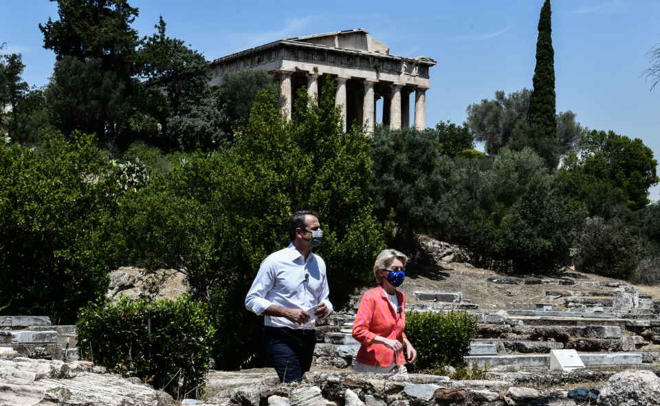 Ξεκίνησε λίγο πριν τις 12:00 το πρωί η επίσκεψη της προέδρου της Ευρωπαϊκής Επιτροπής, Ούρσουλα φον ντερ Λάιεν στην Αρχαία Αγορά της Αθήνας όπου μαζί με τον πρωθυπουργό, Κυριάκο Μητσοτάκη δίνουν πανηγυρικό τόνο στην επικύρωση του Εθνικού Σχεδίου Ανάκαμψης «Ελλάδα 2.0» στο πλαίσιο του οποίου τα επόμενα χρόνια αναμένεται να φθάσει στη χώρα ένας πακτωλός οικονομικών πόρων ύψους 32 δισ. ευρώ που, εφόσον αξιοποιηθούν, θα αλλάξουν άρδην το παραγωγικό μοντέλο.