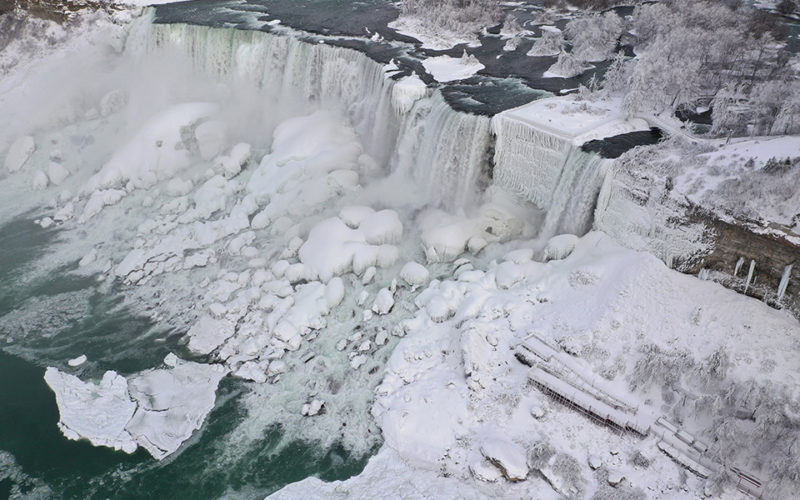 Η εικόνα, αν και δεν είναι ασυνήθιστη για αυτή την εποχή του χρόνου, είναι εν τούτοις πραγματικά εντυπωσιακή και οι αεροφωτογραφίες από τους παγωμένους καταρράκτες κάνουν τον γύρο του κόσμου.