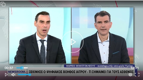 Για την εφαρμογή Ψηφιακός Βοηθός Ιατρού, την πρώτη χρήση τεχνητής νοημοσύνης (ΤΝ) στο δημόσιο σύστημα υγείας, μέσω του Εθνικού Ηλεκτρονικού Φακέλου Υγείας, μίλησε μεταξύ άλλων στην εκπομπή “Newsroom” του ΕΡΤnews και στον Γ. Σιαδήμα ο αναπληρωτής υπ. Υγείας, Μάριος Θεμιστοκλέους.