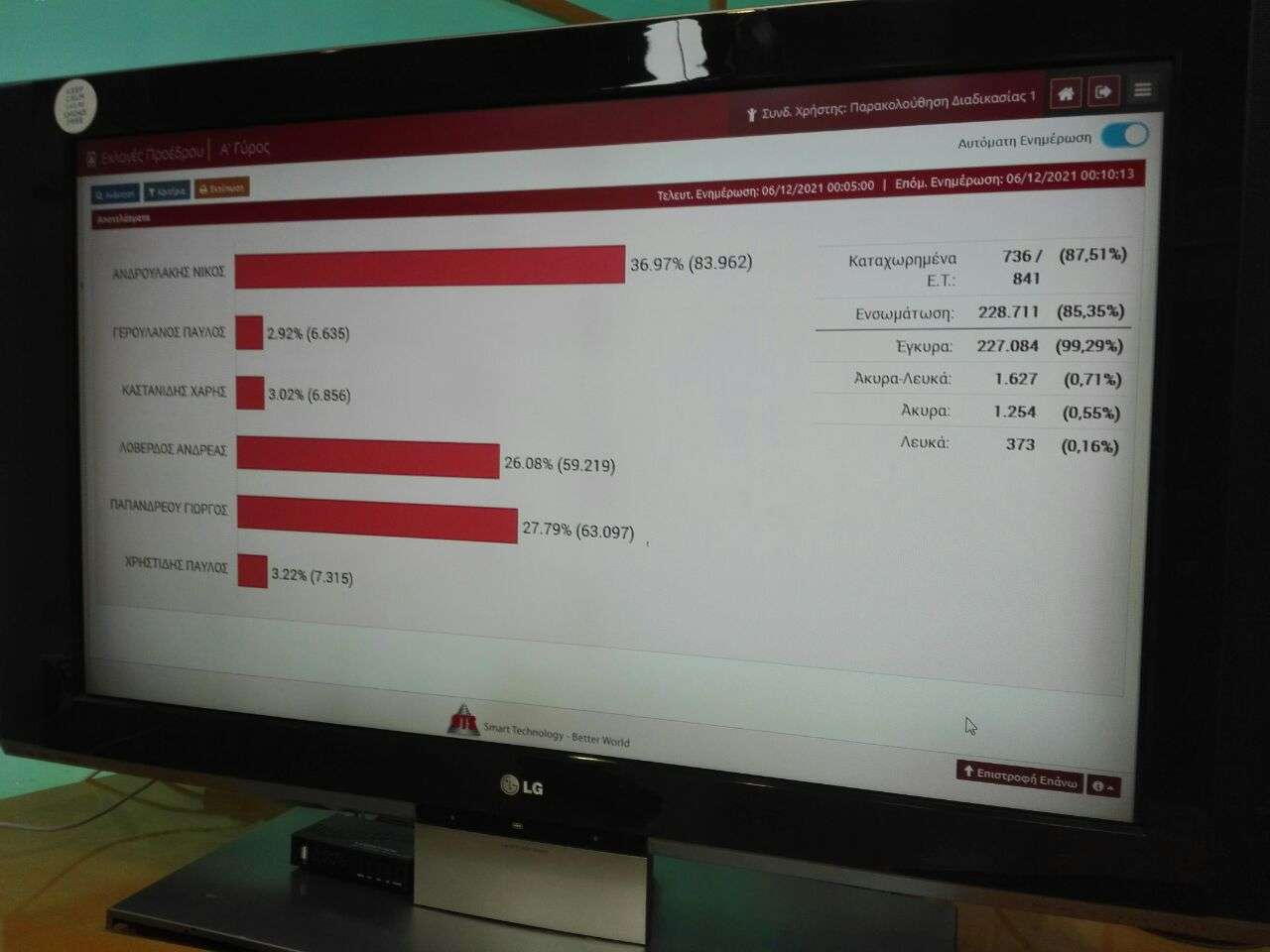 Στο 87,04% των Εκλογικών Τμημάτων οι υποψήφιοι συγκεντρώνουν τα εξής ποσοστά: