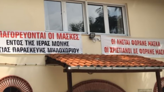 Μάλιστα, όποιος επισκεφτεί αυτό το διάστημα το Μοναστήρι της Αγίας Παρασκευής Μηλοχωρίου Εορδαίας, θα συναντήσει στην είσοδο του, δύο πανό. Το ένα αναφέρει «απαγορεύονται οι μάσκες εντός της Ιεράς Μονής Αγίας Παρασκευής Μηλοχωρίου» και το άλλο, «οι λησταί φοράνε μάσκα, οι Χριστιανοί δε φοράνε μάσκα».