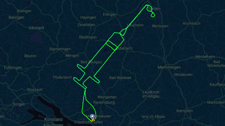Ένας νεαρός πιλότος «ζωγράφισε» μια τεράστια σύριγγα στον ουρανό της Βαυαρίας, πραγματοποιώντας μια πτήση περίπου 300 χιλιομέτρων, με την ευκαιρία της έναρξης των εμβολιασμών για την Covid-19 στην Ευρώπη.