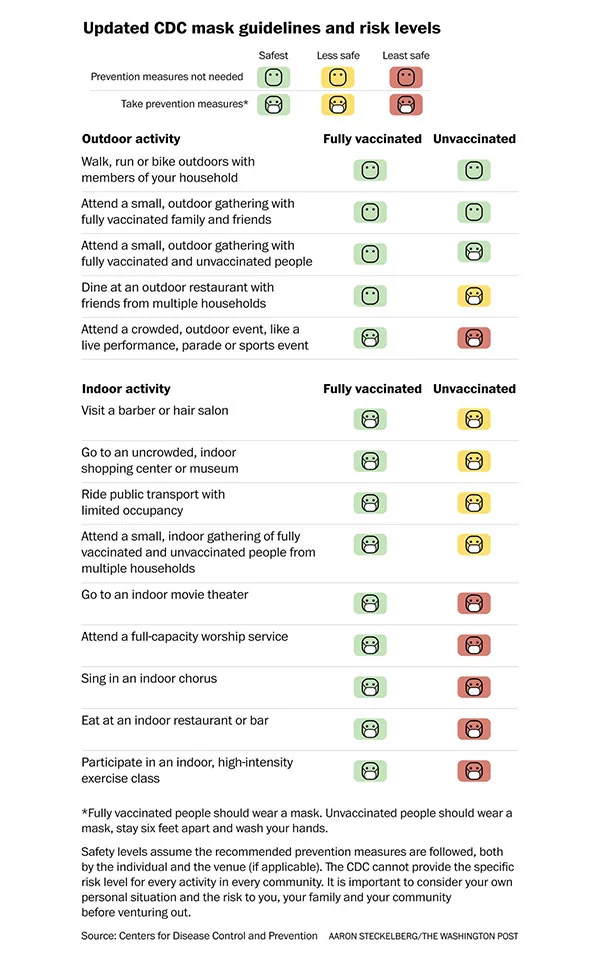 Οι ομοσπονδιακοί αξιωματούχοι των ΗΠΑ ανακοίνωσαν ότι τα περίπου 96 εκατομμύρια Αμερικανών που έχουν εμβολιαστεί πλήρως κατά του νέου κορωνοϊού, μπορούν πλέον να μην φορούν μάσκα για ορισμένες δραστηριότητες σε εξωτερικούς χώρους.
