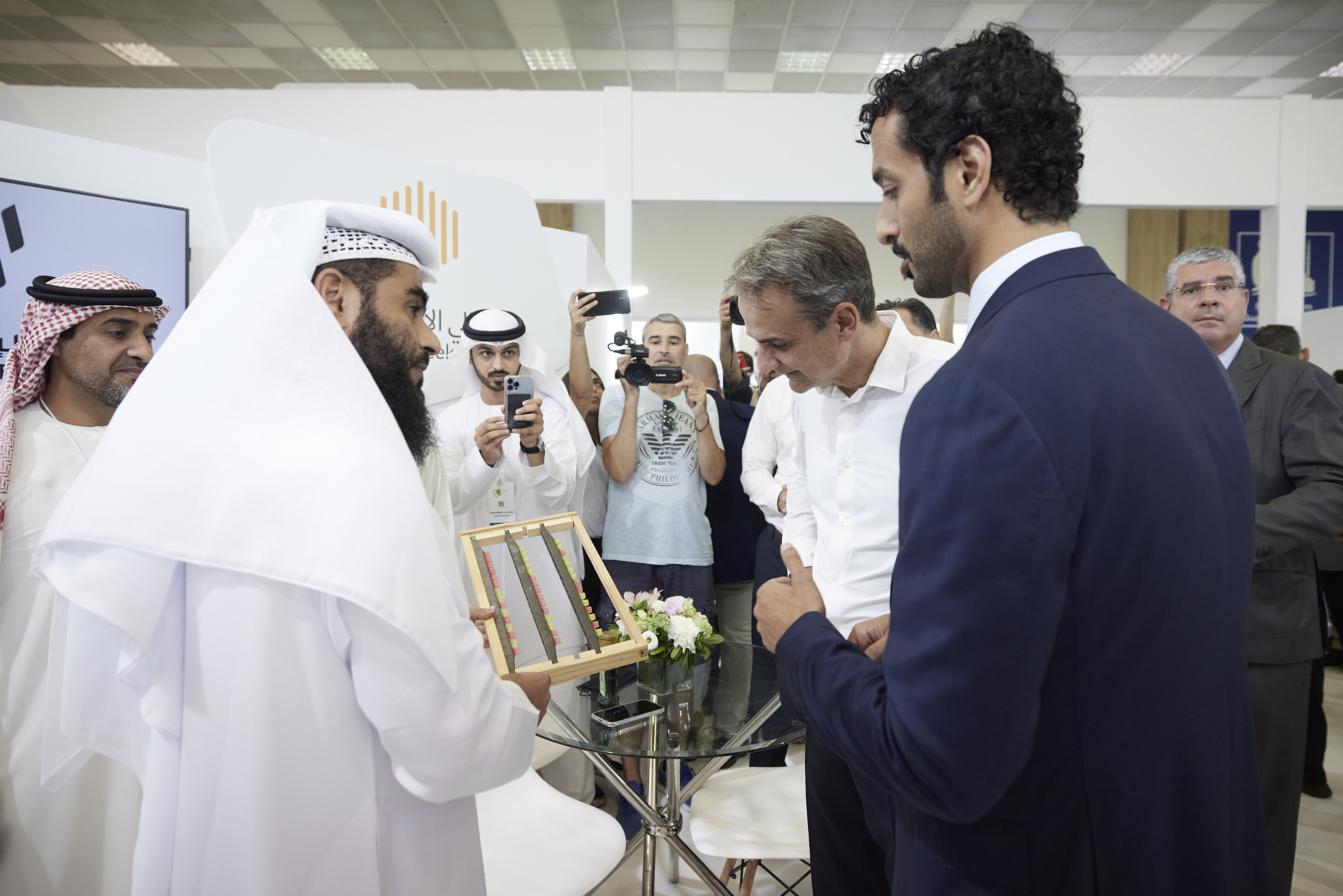 Ο πρωθυπουργός συνέχισε επισκέφθηκε και άλλα σταντ, όπου τον υποδέχθηκαν εκθέτες από τα ΗΑΕ, με κεράσματα και προϊόντα της πατρίδας τους. Σε ένα από τα σημεία που σταμάτησε, φωτογραφήθηκε, μπροστά από προτροπή ενός ‘Αραβα καλλιτέχνη, δίπλα σε ένα πίνακα που απεικόνιζε την επίσκεψη και την πρόσφατη συνάντηση της Προέδρου της Δημοκρατίας Κατερίνας Σακελλαροπούλου, με τον Πρόεδρο των Ηνωμένων Αραβικών Εμιράτων, σεΐχη Μοχάμεντ Μπιν Ζαγέντ Αλ Ναχιάν, στο Προεδρικό Μέγαρο.