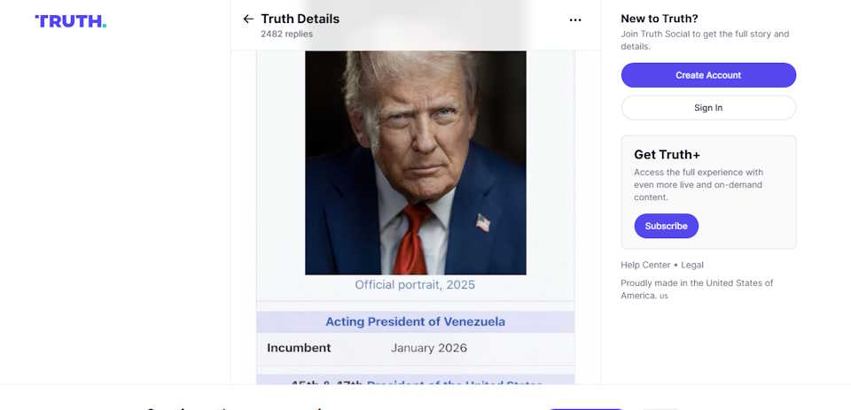 Η ανάρτηση του Αμερικανού προέδρου έρχεται λίγες μέρες μετά τις δηλώσεις του ότι οι ΗΠΑ θα «κυβερνήσουν» προσωρινά τη Βενεζουέλα κατά τη διάρκεια της μεταβατικής περιόδου και θα «ρυθμίσουν τη ροή του πετρελαίου» και σε λίγο περισσότερο από μια εβδομάδα αφότου οι ΗΠΑ επιτέθηκαν στη Βενεζουέλα και συνέλαβαν τον πρόεδρό της, Νικολάς Μαδούρο.
