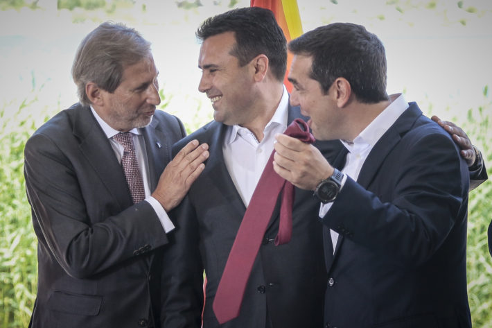 Με μια συμβολική κίνηση του Ζόραν Ζάεφ προς τον Αλέξη Τσίπρα ολοκληρώθηκε η τελετή υπογραφής της συμφωνίας για το ονοματολογικό της πΓΔΜ.