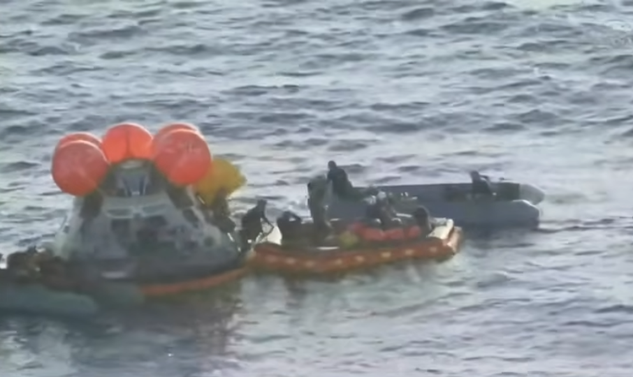 Οι τέσσερις αστροναύτες επέστρεψαν στην ατμόσφαιρα από ύψος 400.000 ποδιών και με ταχύτητα 30 φορές την ταχύτητα του ήχου, μέσα στην πύρινη κάψουλα Orion που κατάφερε να προσθαλασσωθεί όρθια στον Ειρηνικό Ωκεανό, στα ανοικτά των ακτών του Σαν Ντιέγκο.