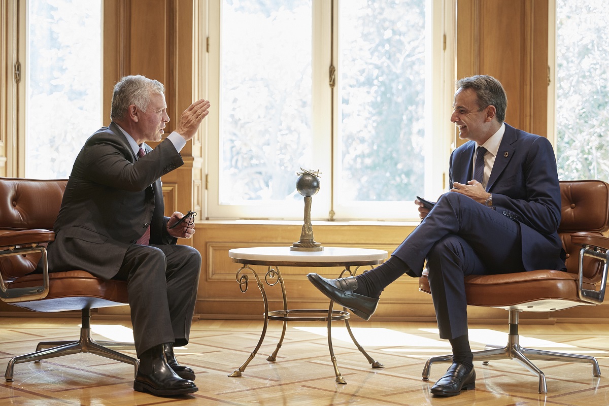 Σε θερμό κλίμα ο πρωθυπουργός Κυριάκος Μητσοτάκης συναντήθηκε, σήμερα, με τον βασιλέα της Ιορδανίας, Αμπντάλα Β ιμπν Αλ-Χουσεΐν, ο οποίος ήρθε στην Αθήνα όπου πραγματοποιήθηκε η Τριμερής Σύνοδος Κορυφής Ελλάδας- Κύπρου- Ιορδανίας.