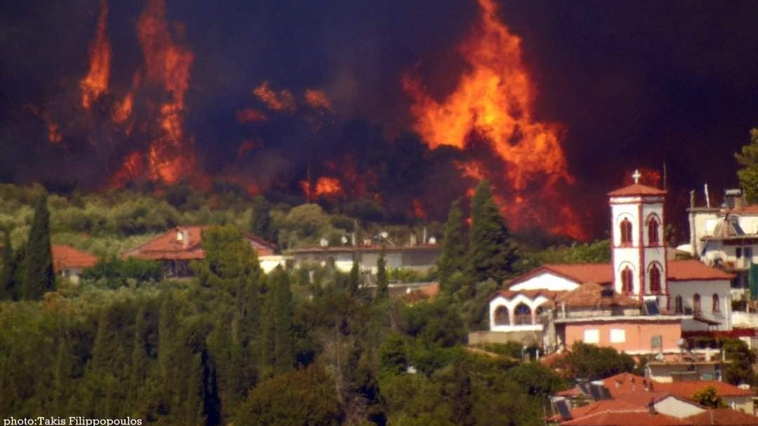 Οι φλόγες έφτασαν στις αυλές των σπιτιών, ενώ η φωτιά έχει περικυκλώσει από δύο πλευρές το χωριό Γρύλλος. Για την περιοχή έχει σταλεί και μήνυμα εκκένωσης από το 112.