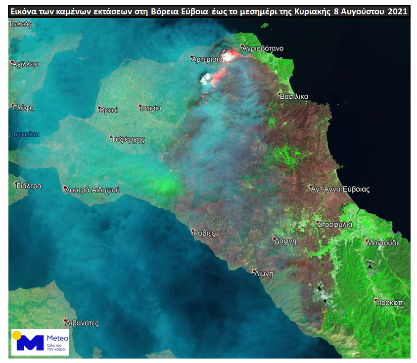 Στις Εικόνα 1 παρουσιάζονται με καφέ αποχρώσεις οι καμένες περιοχές και τα κυριότερα ενεργά μέτωπα το μεσημέρι της Κυριακής 08/08 (Εικόνα 1), με το μέτωπο κοντά στο Αρτεμίσιο να ξεχωρίζει.