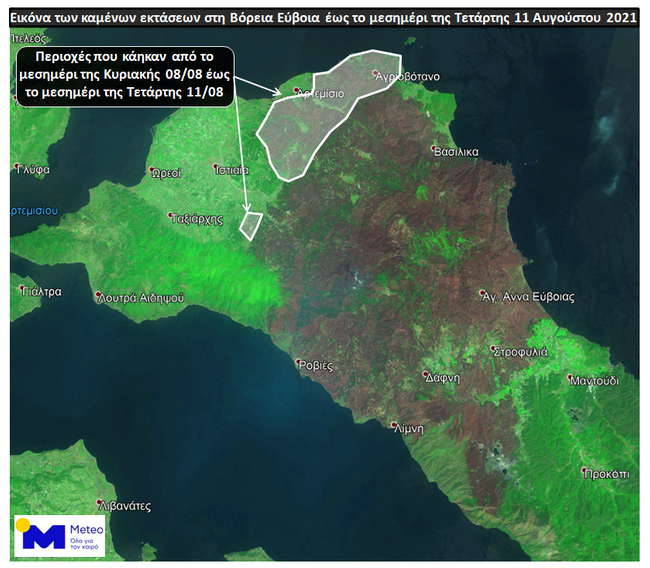 Με βάση τις εικόνες αυτές και σύμφωνα με τους υπολογισμούς μας στο Εθνικό Αστεροσκοπείο Αθηνών / meteo.gr, οι καμένες εκτάσεις την Κυριακή 08/08 ήταν περίπου 460.000 στρέμματα ενώ την Τετάρτη 11/08 510.000 στρέμματα. Οι εκτάσεις λοιπόν που κάηκαν τις τρεις τελευταίες ημέρες ανέρχονται σε 50.000 στρέμματα περίπου.