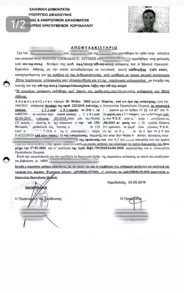 Όπως αναφέρεται στο έγγραφο, ο γιος, ο οποίος είχε φυλακιστεί μετά την άγρια δολοφονία της μητέρας του, κρίθηκε σκόπιμο να αποφυλακιστεί και μεταφερθεί για νοσηλεία στο ψυχιατρικό ίδρυμα, Δρομοκαΐτειο.