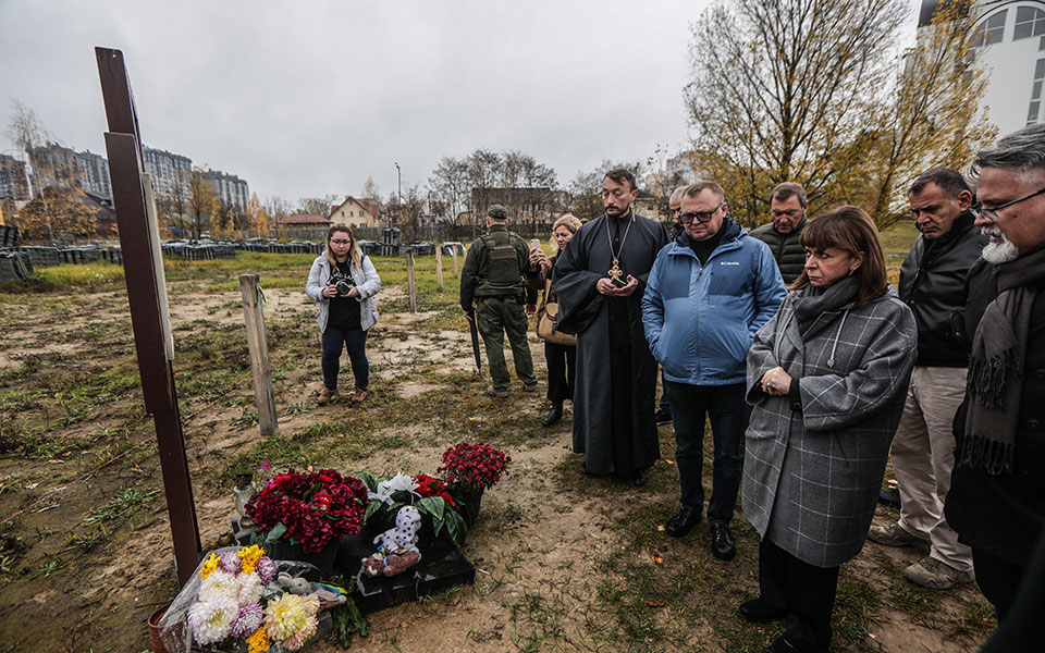 Στη Μπούτσα, η κυρία Σακελλαροπούλου περιηγήθηκε στο σημείο που βρέθηκαν ομαδικοί τάφοι Ουκρανών πολιτών στον περίβολο της εκκλησίας του Αγίου Ανδρέα και είδε φωτογραφική έκθεση με αμάχους θύματα του πολέμου.
