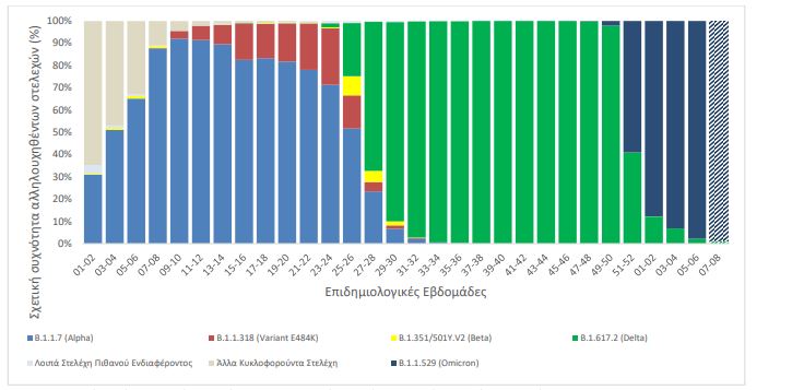 Η διαχρονική εξέλιξη της σχετικής συχνότητας των αλληλουχηθέντων δειγμάτων από τυχαία δειγματοληψία ανά είδος στελεχών, μέχρι και την εβδομάδα 06 του 2022 απεικονίζεται στο Διάγραμμα 8, ενώ δίνονται επιπλέον προσωρινά στοιχεία για τις εβδομάδες 07-08.