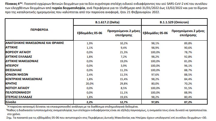 Μεταξύ των 488 δειγμάτων που έχουν ληφθεί ή επιλεγεί στοχευμένα κατά τη διάρκεια του διμήνου πριν τις 21 Φεβρουαρίου 2022, 79% αφορούν το στέλεχος Omicron και 21% στο στέλεχος Delta.