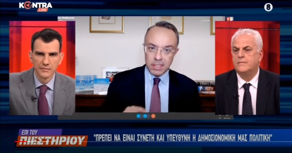 Ουπουργός Οικονομικών Χρήστος Σταϊκούρας απάντησε στο ερώτημα των Γιώργου Σιαδήμα και Βασίλη Σκουρή στην εκπομπή «Επί του Πιεστήριου» στο Kontra για το αν υπάρχει δημοσιονομικός χώρος κατά την εκτέλεση του προϋπολογισμού για την καταβολή του έκτακτου επιδόματος Πάσχα στα ευάλωτα νοικοκυριά, μετά τα όσα συμβαίνουν στην Ουκρανία.