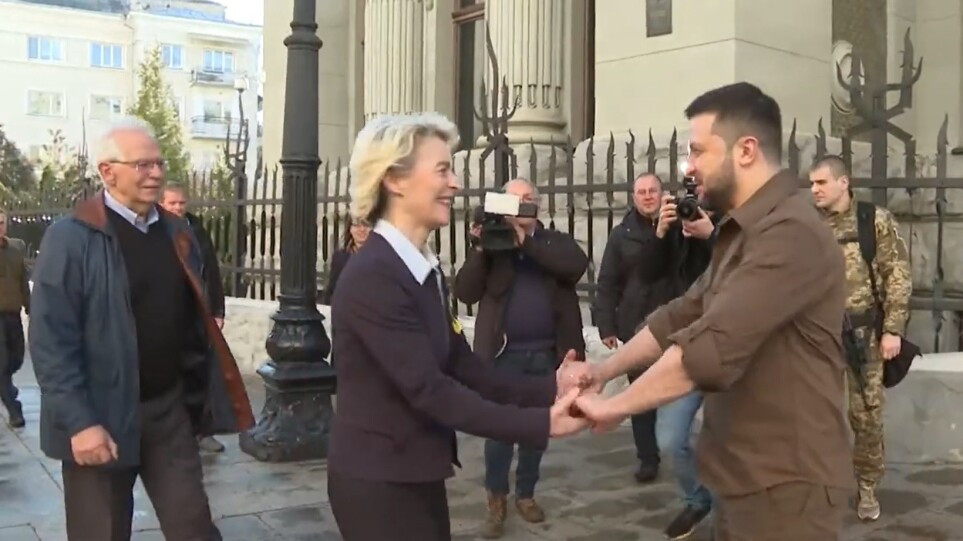 Ο ουκρανός ηγέτης περίμενε την πρόεδρο της Κομισιόν έξω από το κτίριο της προεδρίας. Μαζί της ήταν και ο επικεφαλής της ευρωπαϊκής εξωτερικής πολιτικής, Ζοζέπ Μπορέλ.