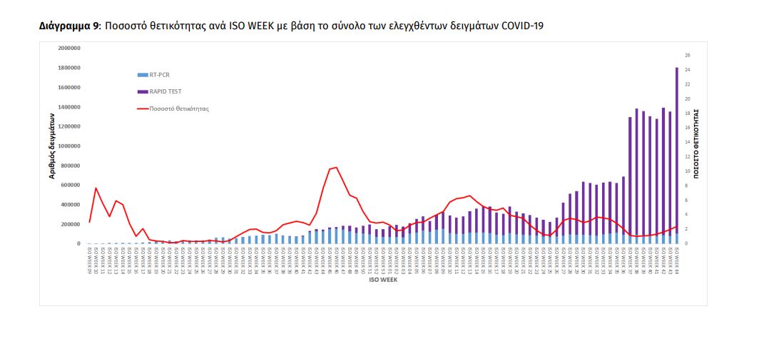 Την εβδομάδα αναφοράς, το ποσοστό θετικότητας ήταν 2.39% σε σύνολο 1.805.427 εργαστηριακών ελέγχων (RT-PCR/Rapid-Ag) και 0.48% σε σύνολο 2.298.907 αυτοδιαγνωστικών ελέγχων. Στο σύνολο των ελέγχων, το ποσοστό θετικότητας ήταν 1.05%.