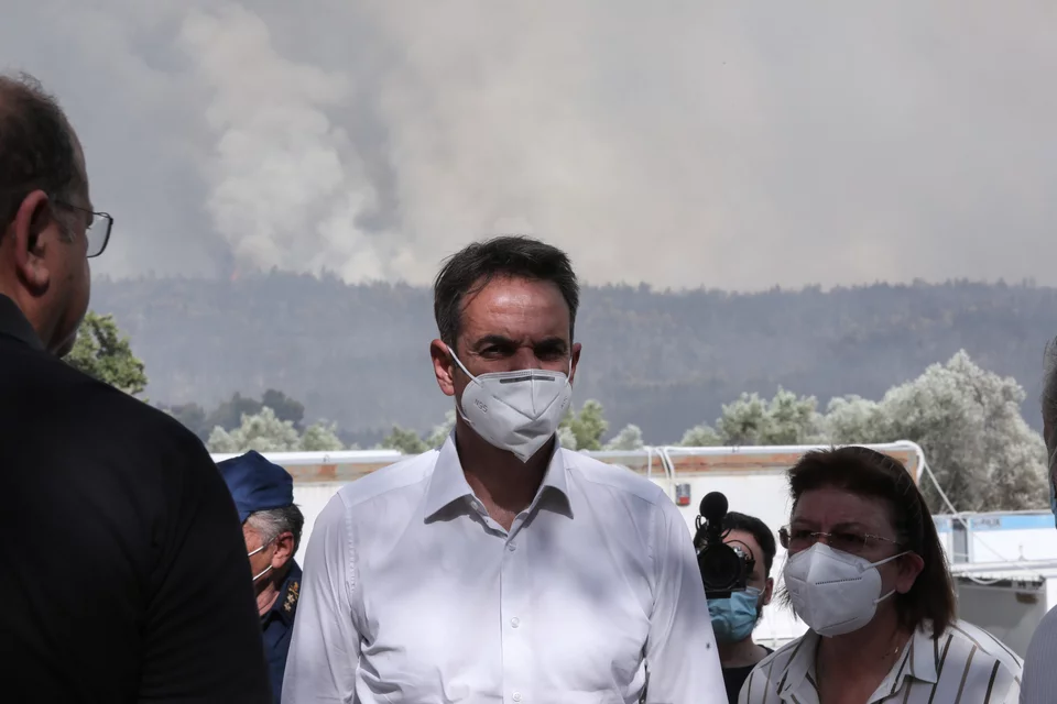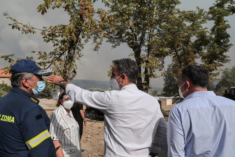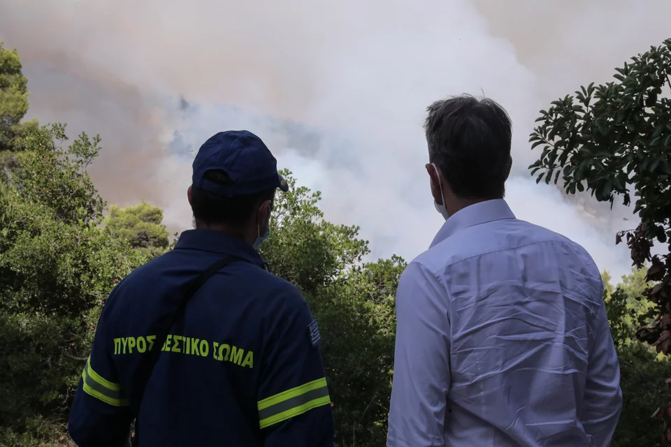 Το απόγευμα ο Κυριάκος Μητσοτάκης μετέβη προς τη Βαρυμπόμπη και το μέτωπο της φωτιάς που αναζωπυρώθηκε από το πρωί.