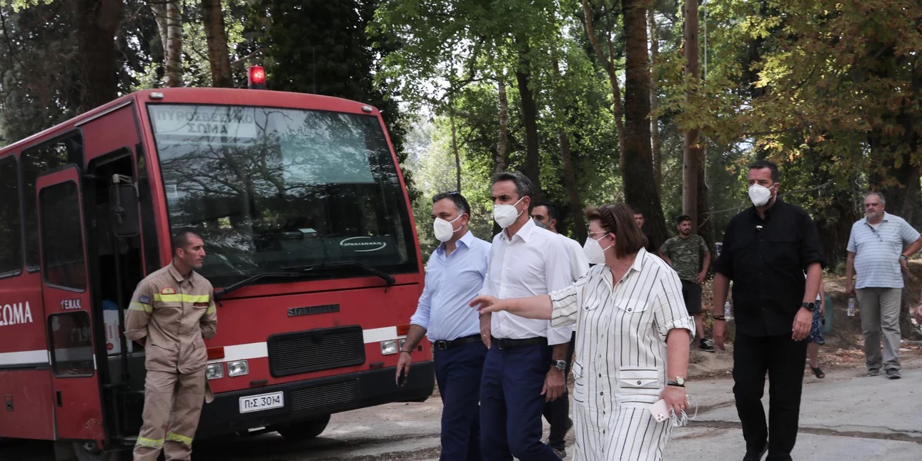 Το απόγευμα ο Κυριάκος Μητσοτάκης μετέβη προς τη Βαρυμπόμπη και το μέτωπο της φωτιάς που αναζωπυρώθηκε από το πρωί.