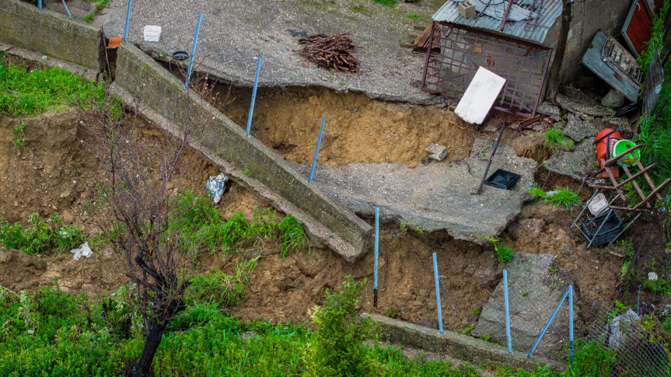 Μια ολόκληρη πλαγιά υποχωρεί, βάζοντας σε κίνδυνο τις κατοικίες, ενώ ήδη έχει καταστραφεί μέρος του δρόμου.