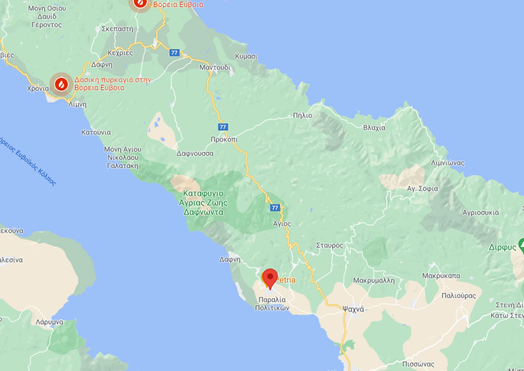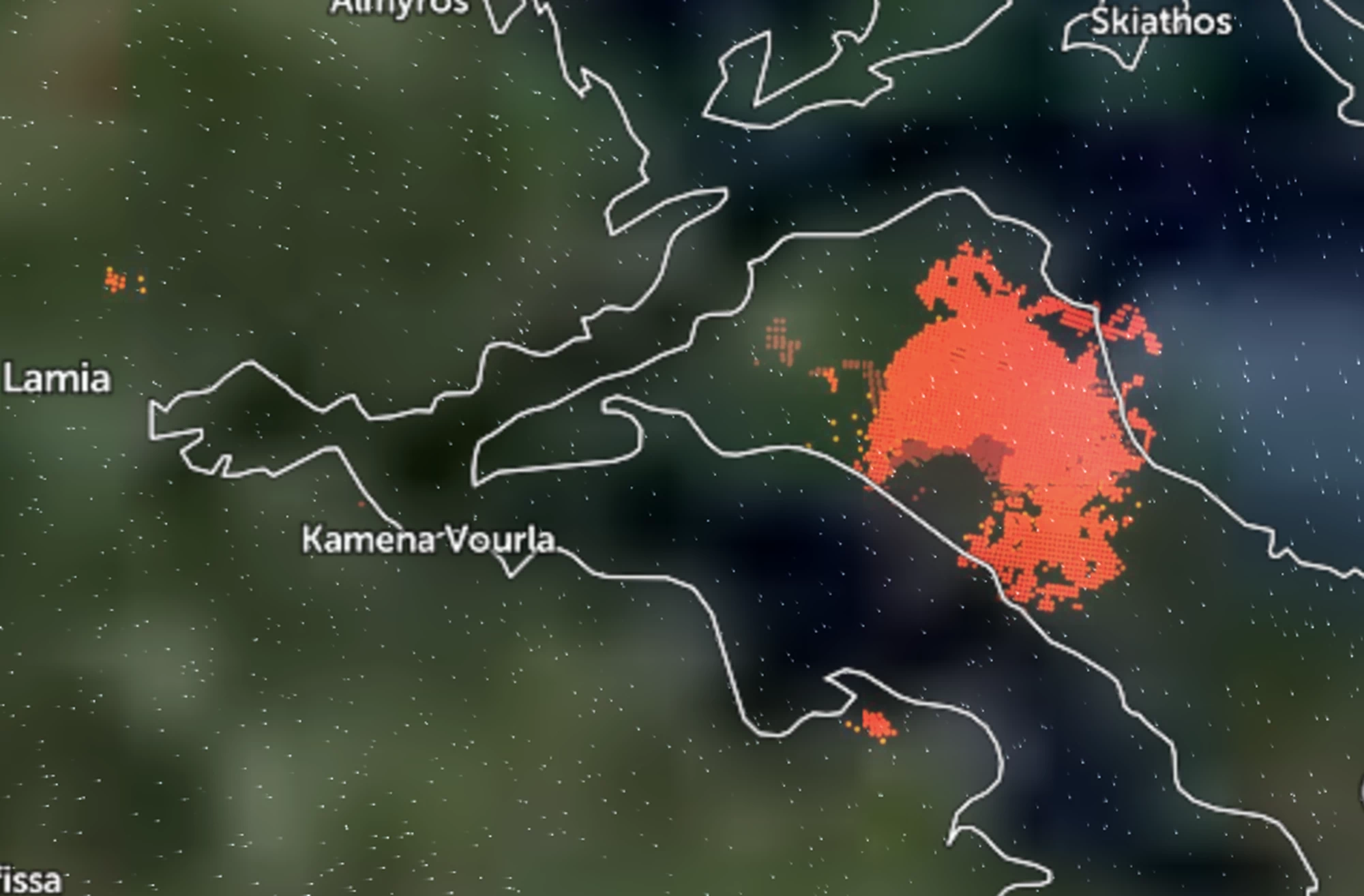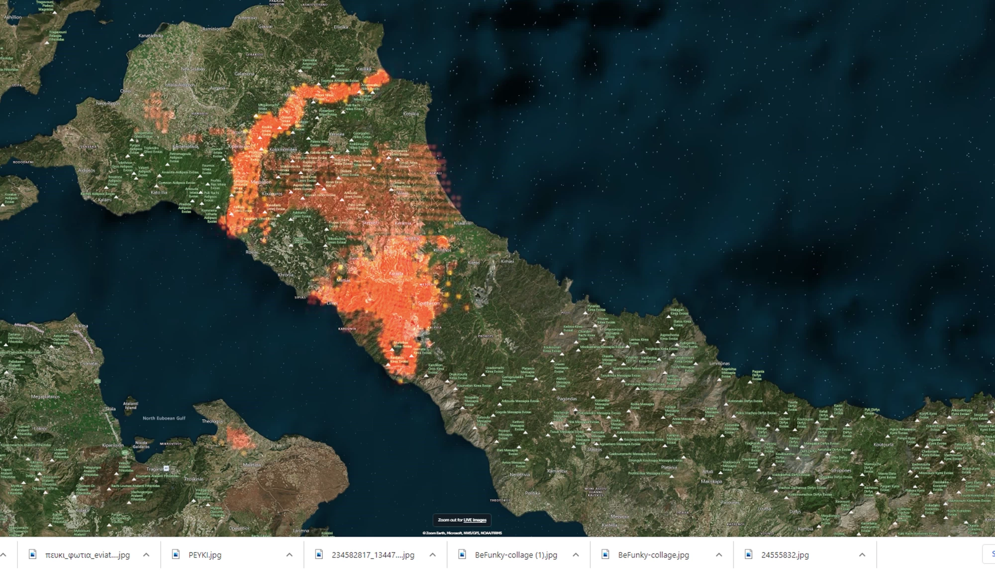Όπως θα δείτε και στο παρακάτω στιγμιότυπο από την εφαρμογή Zoom Earth, όλο το βόρειο τμήμα της Εύβοιας έχει τυλιχτεί στης φλόγες.