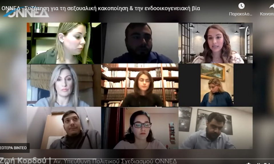 Με αφορμή τα περιστατικά σεξουαλικής βίας και κακοποίησης που έχουν δει το φως της δημοσιότητας και έχουν απασχολήσει ιδιαίτερα το δημόσιο διάλογο, αλλά και σε συνέχεια των προτάσεων που κατέθεσε η ΟΝΝΕΔ στον Υπουργό Δικαιοσύνης για την τροποποίηση άρθρων του Ποινικού Κώδικα που αφορούν εγκλήματα κατά της γενετήσιας ελευθερίας, πραγματοποιήθηκε τηλεδιάσκεψη με θέμα την σεξουαλική κακοποίηση, την έμφυλη και την ενδοοικογενειακή βία.